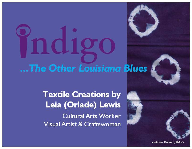 My creative approach to visioning and designing Louisiana Indigo (TM) is deeply informed by my appreciation and studies of Yoruba (Nigerian) adire cloth design, patterning, and dyeing techniques. The West African indigo cultural arts tradition has been carried forward over many generations by artisan families, at centers of trade, via women's guilds, through community based arts schools, and contemporary artist entrepreneurs.